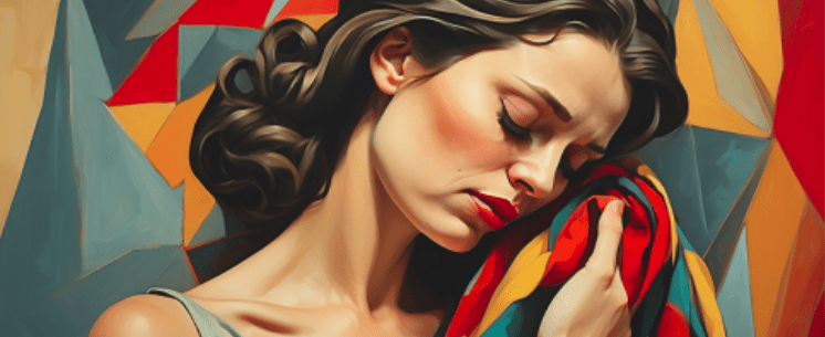 Oil canvas of a Picasso-style work, the background is a blue sunset with a girl curled up with her back to us, use only cold range of color.