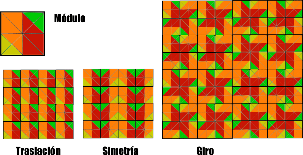 Un módulo puede ser usado en distintas posiciones dentro de una red modular con el objetivo de dar dinamismo y movimiento al ritmo de la composición. Uno de los más usuales es el giro, junto al desplazamiento, y se emplea para crear algún tipo de simetría. Esto puede dar como resultado lo que se conoce como supermódulo; una figura más compleja, pero que tiene más atracción visual y por lo tanto nos resulta más fácil visualizarla y aislarla como forma independiente.